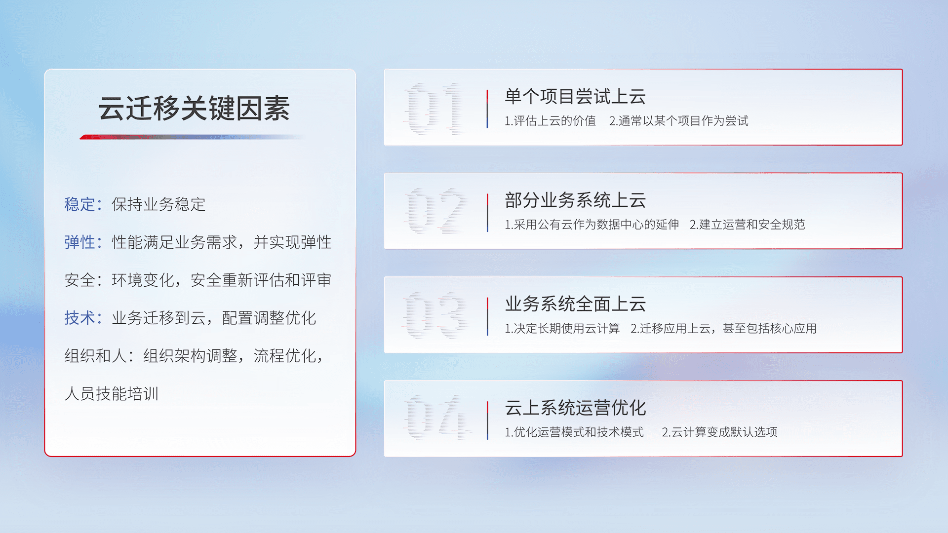 结合实际业务,,,从规划设计、、、、云平台选型、、、、云原生改造、、数据迁移、、、集成交付,,迁移全过程为客户识别最佳上云路径,,,,做好风险识别管理,,,设计网络架构、、、身份权限、、、安全审计合规、、、、操作审计、、、日志审计、、监控告警策略、、、、多站点容灾设计等,,,对云上基础设施进行整体规划,,提升IT治理水平,,,,以满足弹性、、高可用、、、、高性能的需求。。。