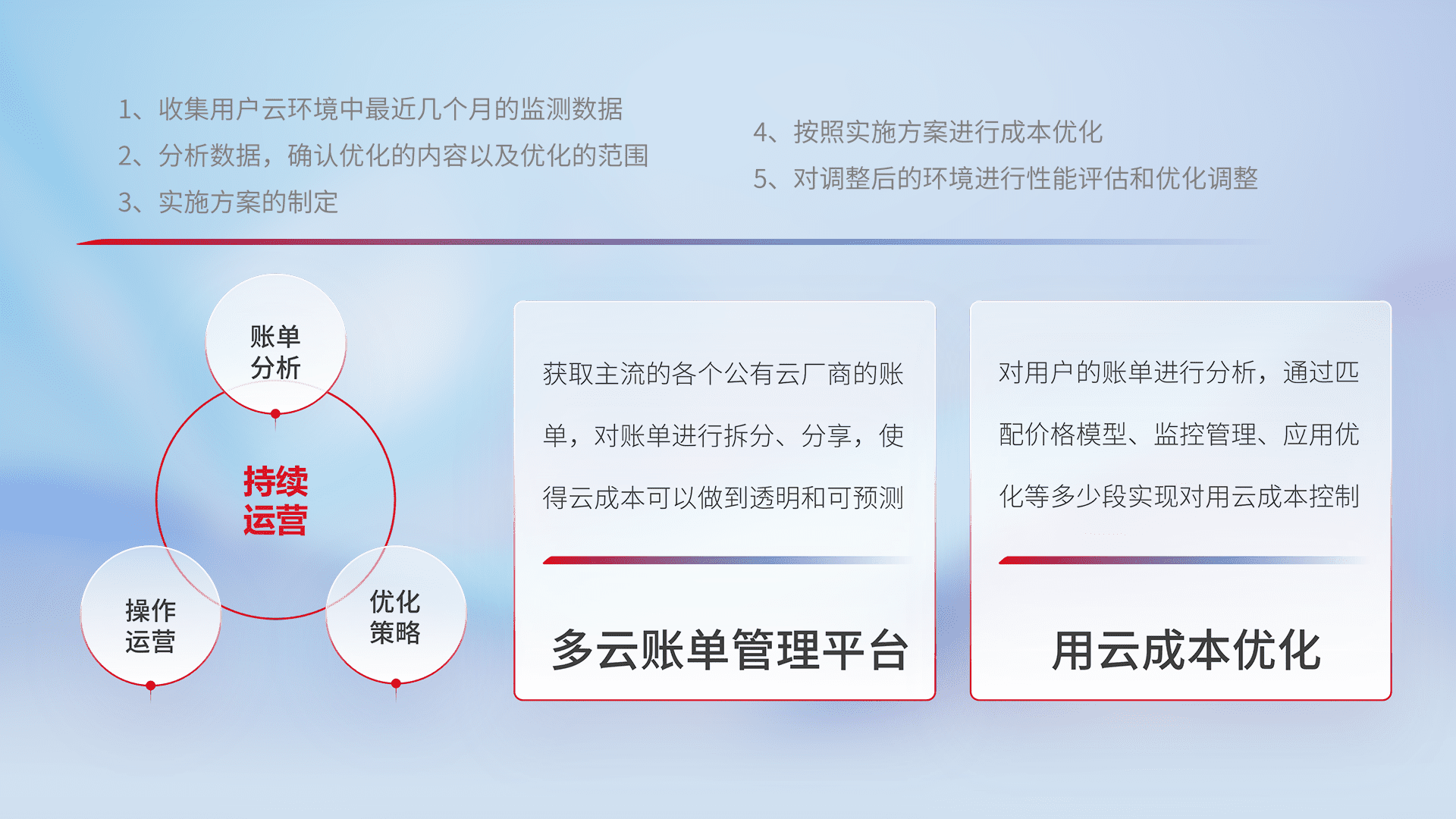 通过多云纳管,,,以统一的资源数据模型把客户的云资源进行抽象和封装,,,,进而实现对多云资源的统一操作,,,保障云资源管理的可靠性、、、、稳定性与可用性。。。量身定制化运维内容,,,配置、、开发运维、、、补丁管理、、、、备份、、、监控、、认证和访问管理、、、、审计和日常巡检等,,,保障在用云过程中的可靠度,,稳定度以及高可用率。。